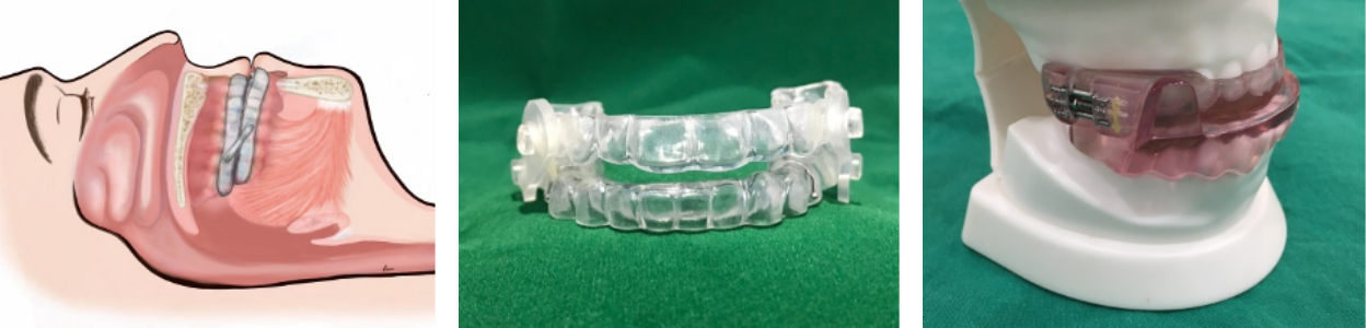 1. อุปกรณ์ยึดลิ้นให้ยื่นมาด้านหน้า (tongue retaining device) เป็นอุปกรณ์ที่จะช่วยยึดลิ้นไว้ให้ยื่นมาทางด้านหน้า ไม่ให้ตกลงไปอุดทางเดินหายใจขณะนอนหลับ ส่วนใหญ่เหมาะสำหรับผู้ที่ไม่มีฟัน ผู้ที่มีโรคเหงือก หรือโรคของข้อต่อขากรรไกร (temporomandibular disorder)