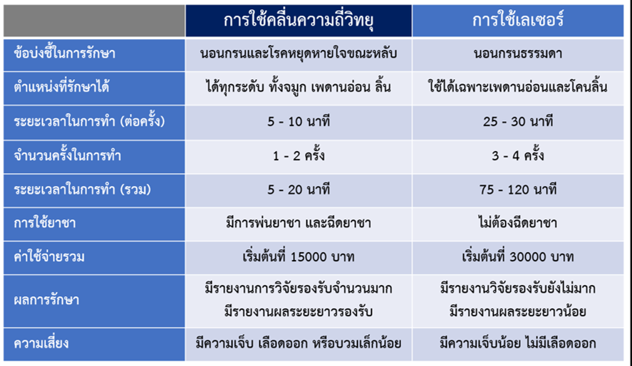 ปัจจุบันการใช้คลื่นความถี่วิทยุ (Radiofrequency หรือ RF) และการใช้เลเซอร์ (Erbium-YAG laser) เริ่มเป็นที่นิยมในการนำมาใช้รักษานอนกรน และโรคหยุดหายใจขณะหลับจากการอุดกั้น (obstructive sleep apnea หรือ OSA) อย่างไรก็ตามผู้ป่วยรายงานอาจสงสัยว่า ควรใช้วิธีไหน บทความนี้จึงนำข้อดีและข้อเสียมาเปรียบเทียบกัน เพื่อให้ผู้ป่วยได้เกิดความเข้าใจที่ถูกต้อง ก่อนตัดสินใจเข้ารับการรักษาดังนี้